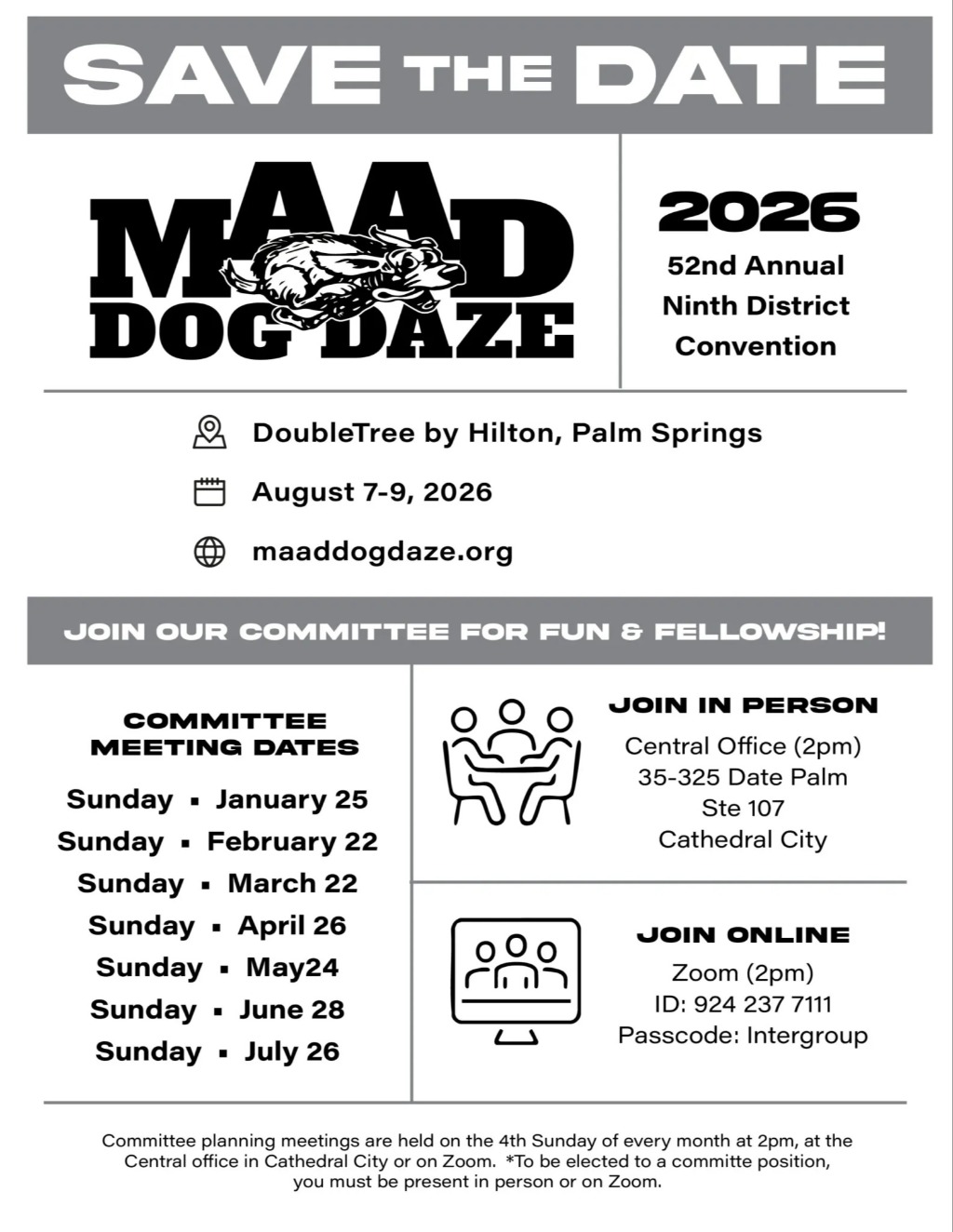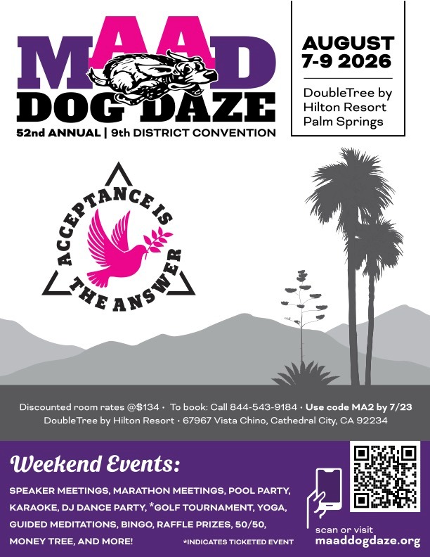 The early conventions were held at the Indio Fairgrounds in a Quonset Hut and over the years the convention has been hosted by a variety of hotels in the Coachella Valley. In spite of all of the various events being held in AA today, MAAD Dog Daze has tried to maintain the original intent of providing a place for desert dwellers and beyond to have a place to get together and celebrate sobriety during the dead of summer.